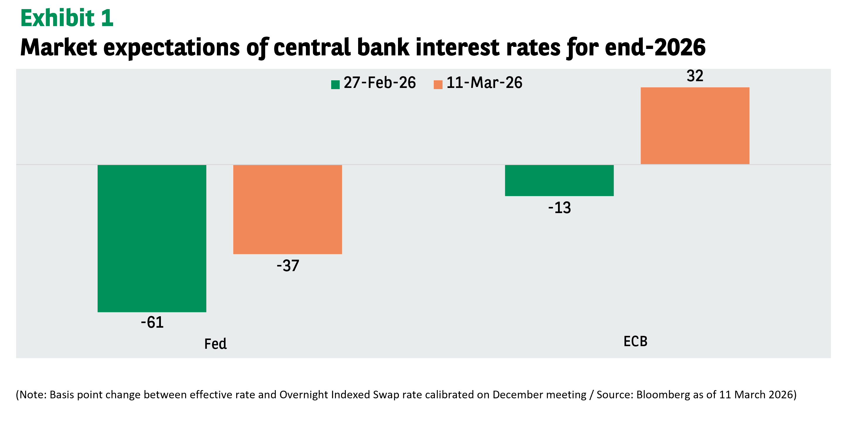 The Middle East conflict is having a significant effect on monetary policy expectations. Prior to the start of the current military action, the market was anticipating the Federal Reserve would make more than two 25-basis-point interest rate cuts this year, while the European Central Bank would ease by around 13bp, based on market pricing. But these expectations have changed to just 37bp of cuts by the Fed and to over 30bp of hikes by the ECB. The main issue is inflation - the longer the oil market remains subject to geopolitical risk, the more likely it is that there will be a monetary policy reaction.