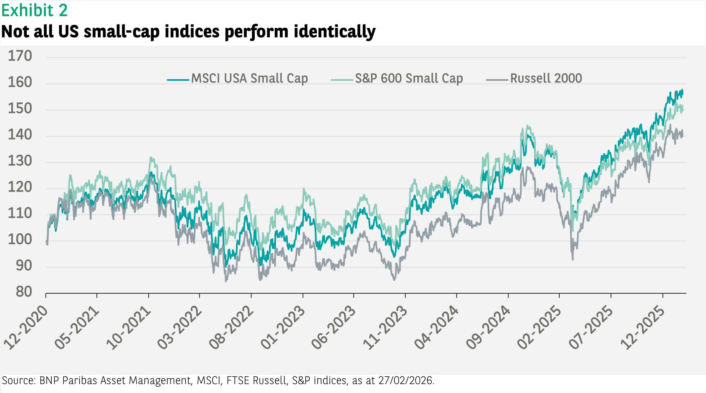 With such a sizeable weight, the largest companies have been the main performance drivers of US large-cap indices: the top 10 contributed 50-60% to index returns in 2024 and 2025. In comparison, the top 10 contribution to the performance of the MSCI USA Small Cap index was only around 15% in 2025.*